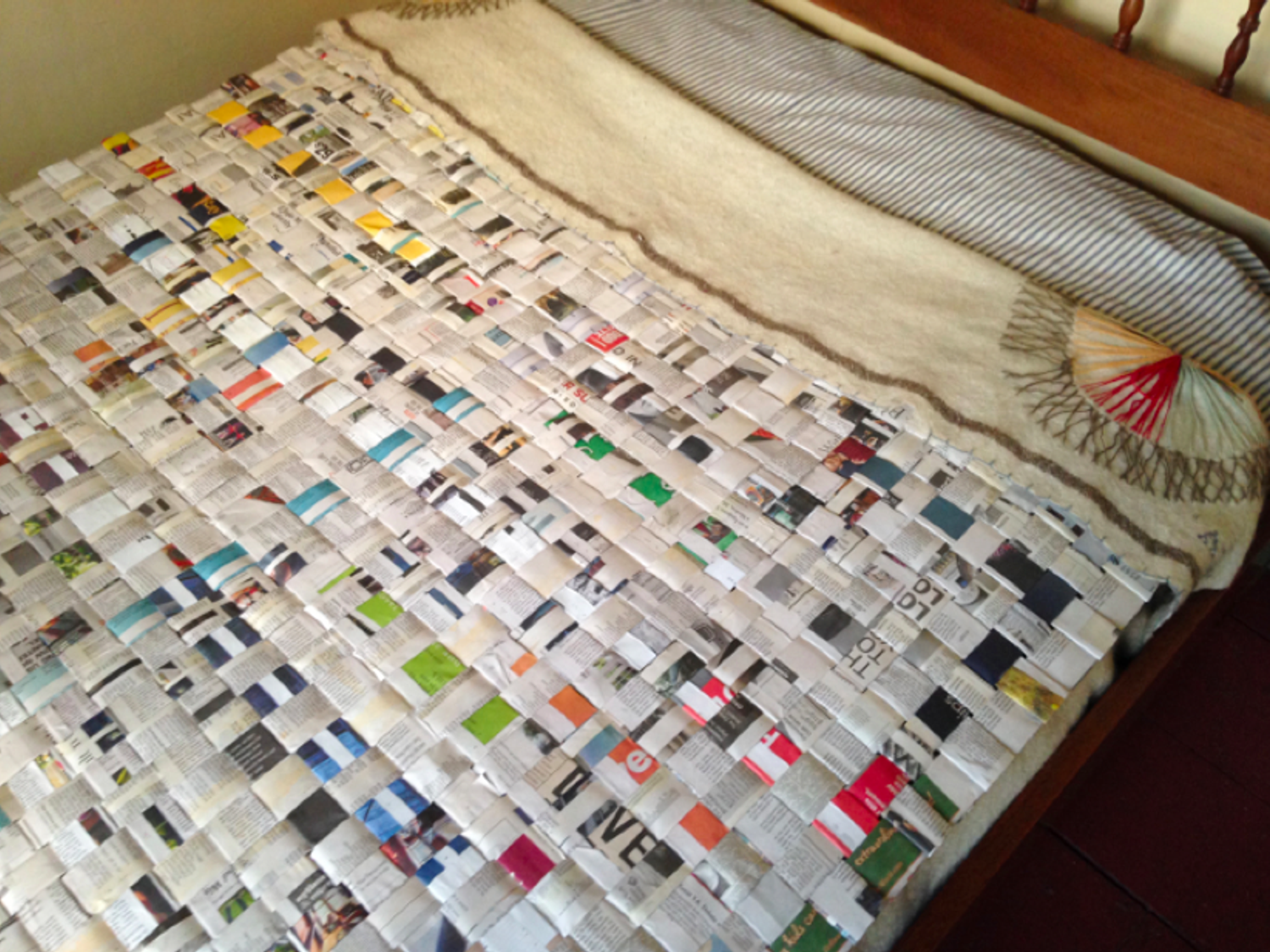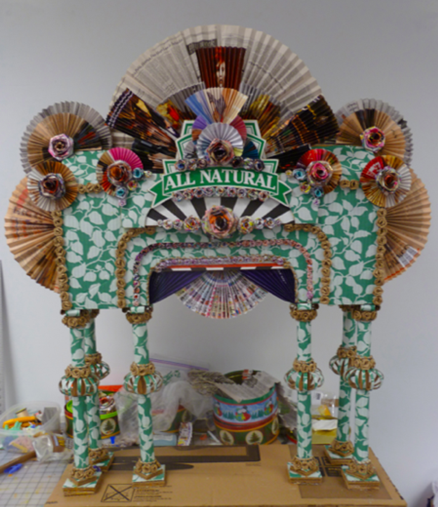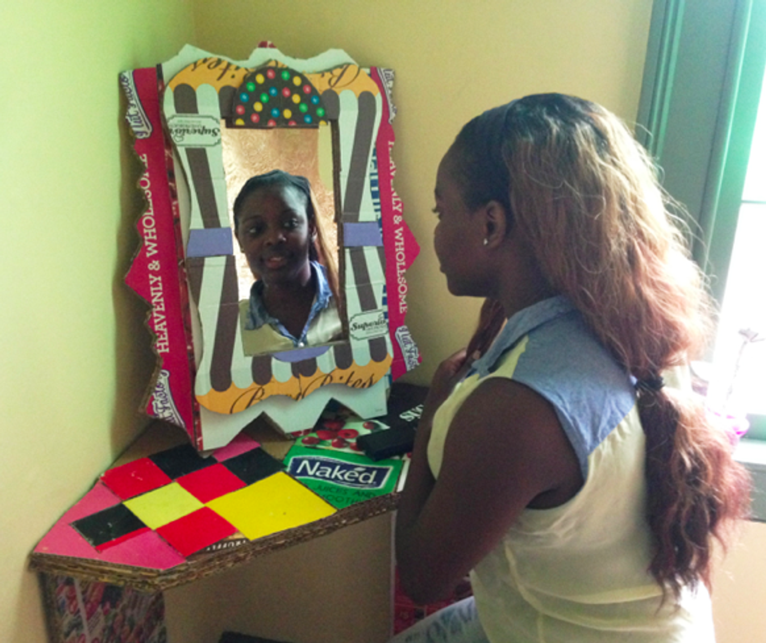 Sistah Paradise: The Lead Mystical African (Haitian Aesthetic) American Folk Character, for rural, urban and suburban bedtime medicinal folktales and contemporary bedtime medicinal lullabies. Photo: Xenobia BaileyFunktional quilt, made from woven New York Times newspaper. Fabricated at Weeksville Heritage Center as part of Funk, God, Jazz and Medicine: Black Radical Brooklyn, sponsored by Creative Time, Summer 2014. Photo: Xenobia BaileyFunktional Decorative Design, door treatment, made with folded New York Times newspaper. Boys & Girls High School collaboration with trash alchemist Xenobia Bailey at Weeksville Heritage Center as part of Funk, God, Jazz and Medicine: Black Radical Brooklyn, sponsored by Creative Time, Summer 2014. Photo: Xenobia BaileyFunktional Design exercise: Alter constructed with found cardboard boxes, fashion magazines, New York Times newspapers and brown paper bags, by trash alchemist Xenobia Bailey. Photo: Xenobia BaileyChair design for culturally relevant furniture for a Funktional Design Class conducted by Xenobia Bailey at Boys & Girls High School as part of Funk, God, Jazz and Medicine: Black Radical Brooklyn, sponsored by Creative Time, Summer 2014. Photo: Xenobia BaileyAfrican (Mali) American student, designing culturally relevant furniture from found cardboard boxes for a Funktional Design Class conducted by Xenobia Bailey at Boys & Girls High School as part of Funk, God, Jazz and Medicine: Black Radical Brooklyn, sponsored by Creative Time, Summer 2014. Photo: Xenobia BaileyAfrican (Bed-Stuy, Brooklyn) American student, designing culturally relevant furniture from found cardboard boxes for a Funktional Design Class conducted by Xenobia Bailey at Boys & Girls High School as part of Funk, God, Jazz and Medicine: Black Radical Brooklyn, sponsored by Creative Time, Summer 2014. Photo: Xenobia BaileyFunktional Design Vanity Table created by African (Jamaican) American students at Boys & Girls High School, fabricated at Weeksville Heritage Center for Funk, God, Jazz and Medicine: Black Radical Brooklyn, sponsored by Creative Time, Summer 2014. Photo: Xenobia BaileyMock-up for the structural and decorative design for a table, by African (Senegal) American design student in Funktional Design Class conducted by Xenobia Bailey at Boys & Girls High School as part of Funk, God, Jazz and Medicine: Black Radical Brooklyn, sponsored by Creative Time, Summer 2014. Photo: Xenobia Bailey Funktional Design Vanity Table created by African (Jamaican) American students at Boys & Girls High School, fabricated at Weeksville Heritage Center for Funk, God, Jazz and Medicine: Black Radical Brooklyn, sponsored by Creative Time, Summer 2014. Photo: Xenobia Bailey